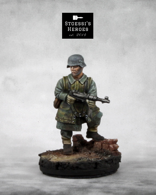Well, essentially I started out with painting the poncho in Green Brown (Model Color). At this stage I already place all the shadows and highlights. Then I applied the actual camo pattern using Splinter Blotches (Model Color) and Reflective Green (Model Color). Next, I started working on highlights and shadows again on the camo pattern and started applying different glazes to a) change the tonalities and bring back some more color and saturation (yellow on the upper half of the figure and green/blue/brown on the lower part) and b) to intensify shadows overall (black-brown or black-brown-blue glazes in the darkest shadows). To finish up the camo pattern, I used German Dark Green to paint a few vertical lines here and there. Done! 🙂